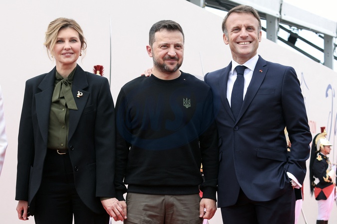 Le président français Emmanuel Macron et la première dame, Brigitte Macron accueillent le président de l'Ukraine, Volodymyr Zelensky et la Première Dame ukrainienne Olena Zelenska lors de la cérémonie internationale du 80ème anniversaire du débarquement à Omaha Beach, le 6 juin 2024. © Stéphane Lemouton / Bestimage President Emmanuel Macron and his wife Brigitte Macron welcome guests to the international ceremony at Omaha Beach as part of the commemoration of the 80th anniversary of the Normandy landings (D-Day) on june 6th 2024
