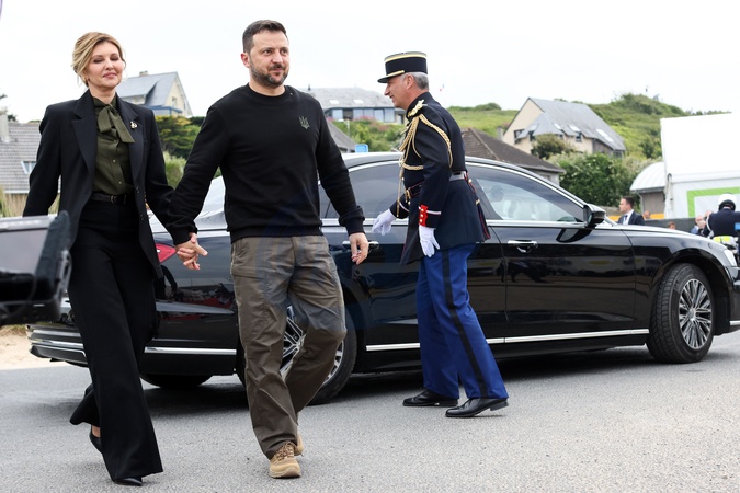 Le président de l'Ukraine, Volodymyr Zelensky et sa femme Olena Zelenska lors de la cérémonie internationale du 80ème anniversaire du débarquement à Omaha Beach, le 6 juin 2024. © Stéphane Lemouton / Bestimage President Emmanuel Macron and his wife Brigitte Macron welcome guests to the international ceremony at Omaha Beach as part of the commemoration of the 80th anniversary of the Normandy landings (D-Day) on june 6th 2024