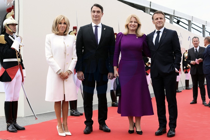 Le président français Emmanuel Macron et la première dame, Brigitte Macron accueillent Zuzana Caputova, présidente de la Slovaquie lors de la cérémonie internationale du 80ème anniversaire du débarquement à Omaha Beach, le 6 juin 2024. © Stéphane Lemouton / Bestimage President Emmanuel Macron and his wife Brigitte Macron welcome guests to the international ceremony at Omaha Beach as part of the commemoration of the 80th anniversary of the Normandy landings (D-Day) on june 6th 2024