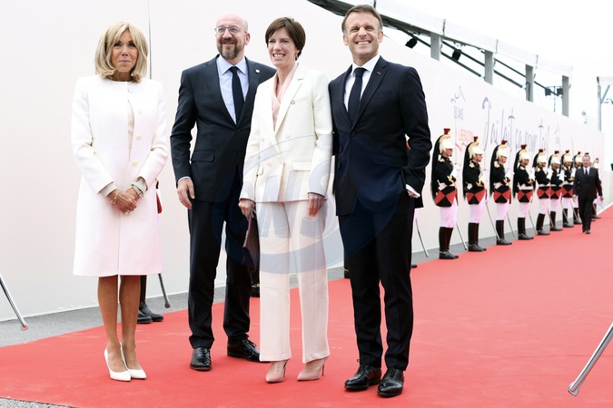 Le président français Emmanuel Macron et la première dame, Brigitte Macron accueillent le président du Conseil européen Charles Michel et son épouse Amélie Derbaudrenghier lors de la cérémonie internationale du 80ème anniversaire du débarquement à Omaha Beach, le 6 juin 2024. © Stéphane Lemouton / Bestimage President Emmanuel Macron and his wife Brigitte Macron welcome guests to the international ceremony at Omaha Beach as part of the commemoration of the 80th anniversary of the Normandy landings (D-Day) on june 6th 2024