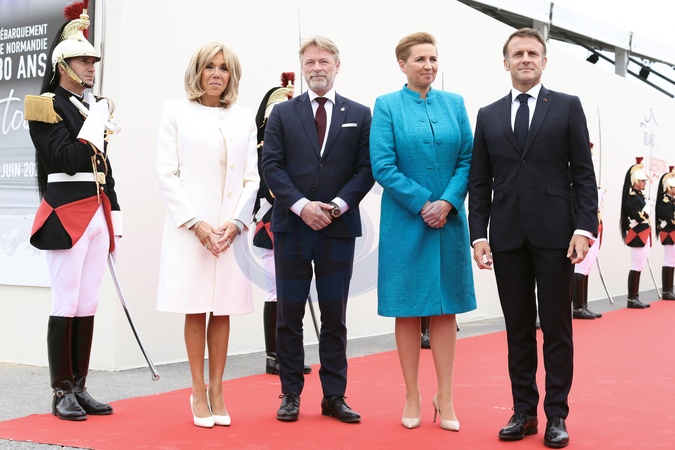 Le président français Emmanuel Macron et la première dame, Brigitte Macron accueillent la première ministre du Danemark Mette Frederiksen et son mari lors de la cérémonie internationale du 80ème anniversaire du débarquement à Omaha Beach, le 6 juin 2024. © Stéphane Lemouton / Bestimage President Emmanuel Macron and his wife Brigitte Macron welcome guests to the international ceremony at Omaha Beach as part of the commemoration of the 80th anniversary of the Normandy landings (D-Day) on june 6th 2024