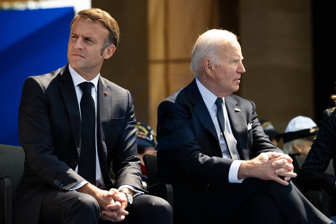 Cérémonie Franco-américaine au cimetière américain de Colleville sur Mer dans le cadre de la commémoration du 80ème anniversaire du débarquement en Normandie (D-Day) le 6 juin 2024. © Jeanne Accorsini / Pool / Bestimage Emmanuel Macron, French President and Joe Biden, President of the United States. Commemoration at Normandy American Cemetery marks the 80th anniversary of D-Day landings along the Normandy coast during the World War II. This event ultimately led to the liberation of Europe. Thursday June 6, 2024, Colleville-sur-mer, Normandy, France.//ACCORSINIJEANNE_COLLEVILLE.0057/Credit:JEANNE ACCORSINI/SIPA/2406070036