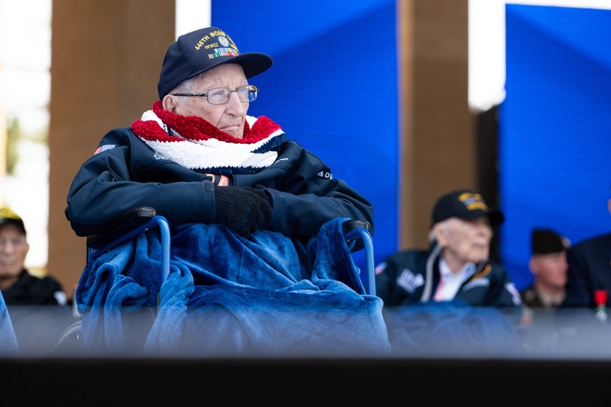 Ceremonia francusko-amerykańska na amerykańskim cmentarzu w Colleville sur Mer w ramach obchodów 80. rocznicy lądowania w Normandii (D-Day