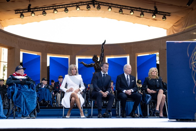 Cérémonie Franco-américaine au cimetière américain de Colleville sur Mer dans le cadre de la commémoration du 80ème anniversaire du débarquement en Normandie (D-Day) le 6 juin 2024. © Jeanne Accorsini / Pool / Bestimage Brigitte Macron, first lady of France and wife of Emmanuel Macron, president of French republic, Joe Biden president of the United states and his wife Jill Bien. Commemoration at Normandy American Cemetery marks the 80th anniversary of D-Day landings along the Normandy coast during the World War II. This event ultimately led to the liberation of Europe. Thursday June 6, 2024, Colleville-sur-mer, Normandy, France.//ACCORSINIJEANNE_COLLEVILLE.0027/Credit:JEANNE ACCORSINI/SIPA/2406070034