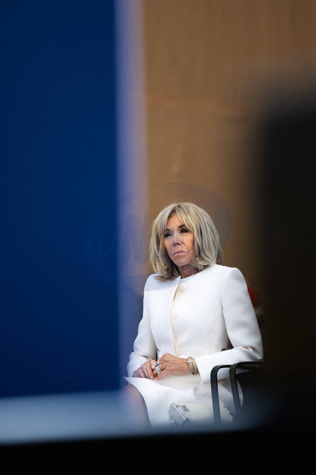 Cérémonie Franco-américaine au cimetière américain de Colleville sur Mer dans le cadre de la commémoration du 80ème anniversaire du débarquement en Normandie (D-Day) le 6 juin 2024. © Jeanne Accorsini / Pool / Bestimage Brigitte Macron first lady of France. Commemoration at Normandy American Cemetery marks the 80th anniversary of D-Day landings along the Normandy coast during the World War II. This event ultimately led to the liberation of Europe. Thursday June 6, 2024, Colleville-sur-mer, Normandy, France.//ACCORSINIJEANNE_COLLEVILLE.0034/Credit:JEANNE ACCORSINI/SIPA/2406070035