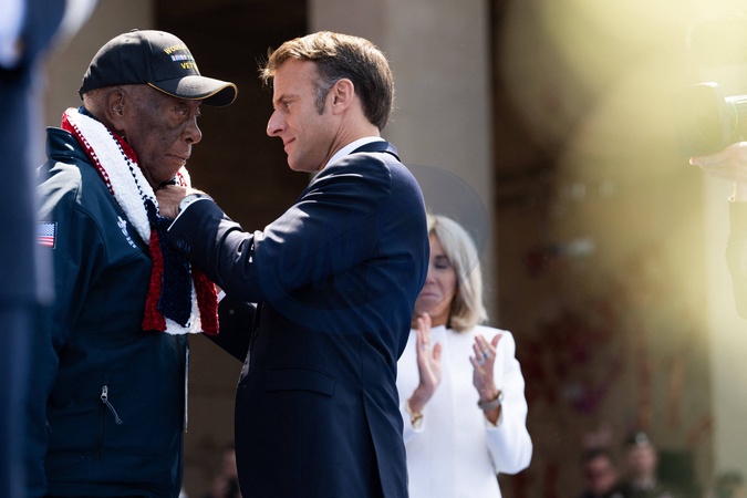 Cérémonie Franco-américaine au cimetière américain de Colleville sur Mer dans le cadre de la commémoration du 80ème anniversaire du débarquement en Normandie (D-Day) le 6 juin 2024. © Jeanne Accorsini / Pool / Bestimage Emmanuel Macron, president of France. Commemoration at Normandy American Cemetery marks the 80th anniversary of D-Day landings along the Normandy coast during the World War II. This event ultimately led to the liberation of Europe. Thursday June 6, 2024, Colleville-sur-mer, Normandy, France.//ACCORSINIJEANNE_COLLEVILLE.0048/Credit:JEANNE ACCORSINI/SIPA/2406070035