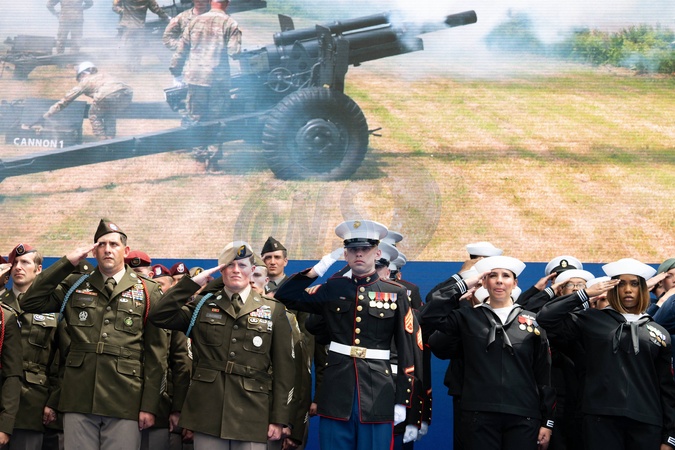 Ceremonia francusko-amerykańska na amerykańskim cmentarzu w Colleville sur Mer w ramach obchodów 80. rocznicy lądowania w Normandii (D-Day