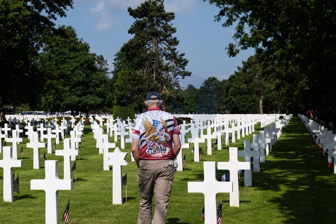 Ceremonia francusko-amerykańska na amerykańskim cmentarzu w Colleville sur Mer w ramach obchodów 80. rocznicy lądowania w Normandii (D-Day