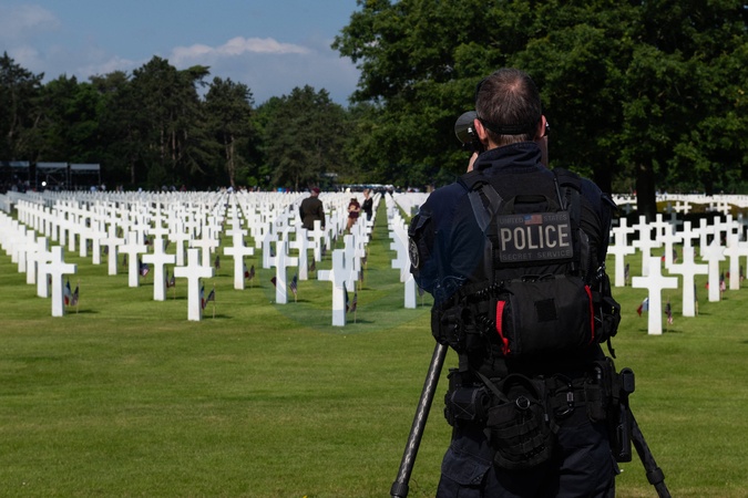 Ceremonia francusko-amerykańska na amerykańskim cmentarzu w Colleville sur Mer w ramach obchodów 80. rocznicy lądowania w Normandii (D-Day