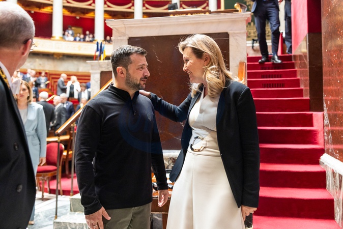 President Volodymyr Zelensky and French president of National Assembly (Parliament) Yael Braun Pivet at the National Assembly during Zelensky visit to Paris on 7 June 2024. © Ukraine Presidency via Bestimage