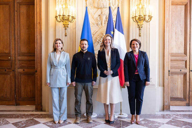 Ukrainian First Lady Olena Zelenska, French president of National Assembly (Parliament) Yael Braun Pivet, Ukrainian president Volodymyr Zelensky and French Member of Parliament Valérie Rabault, pose for a photo at the hotel de Lassay, in Paris, France, on June 7, 2024. © Ukraine Presidencyvia Bestimage