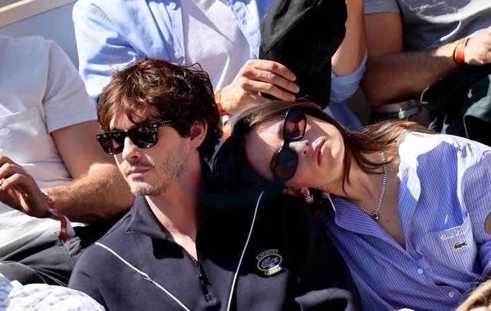 Logan Lerman et sa compagne Analuisa Corrigan - Célébrités dans les tribunes des Internationaux de France de tennis de Roland Garros 2024 à Paris le 7 juin 2024. © Jacovides-Moreau/Bestimage Celebrities in the stands of the 2024 Roland Garros French Open tennis tournament in Paris on June 7, 2024.