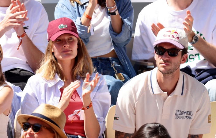 Constance Jablonski et son mari Matthias Dandois - Célébrités dans les tribunes des Internationaux de France de tennis de Roland Garros 2024 à Paris le 7 juin 2024. © Jacovides-Moreau/Bestimage Celebrities in the stands of the 2024 Roland Garros French Open tennis tournament in Paris on June 7, 2024.