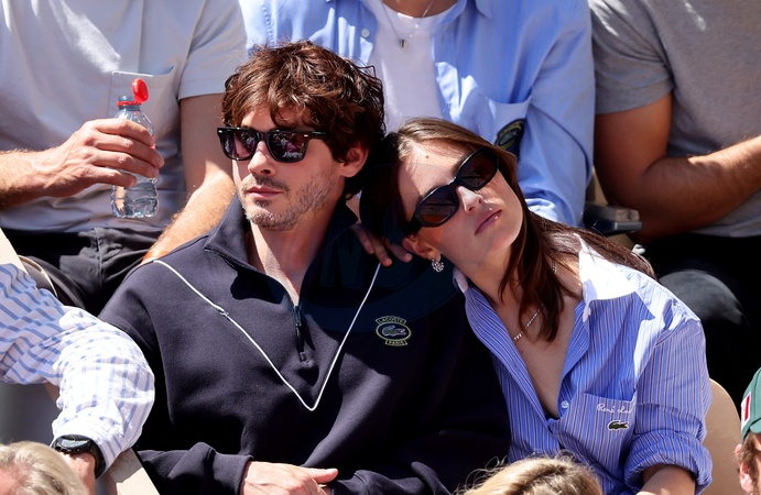Logan Lerman et sa compagne Analuisa Corrigan - Célébrités dans les tribunes des Internationaux de France de tennis de Roland Garros 2024 à Paris le 7 juin 2024. © Jacovides-Moreau/Bestimage Celebrities in the stands of the 2024 Roland Garros French Open tennis tournament in Paris on June 7, 2024.