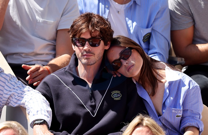 Logan Lerman et sa compagne Analuisa Corrigan - Célébrités dans les tribunes des Internationaux de France de tennis de Roland Garros 2024 à Paris le 7 juin 2024. © Jacovides-Moreau/Bestimage Celebrities in the stands of the 2024 Roland Garros French Open tennis tournament in Paris on June 7, 2024.