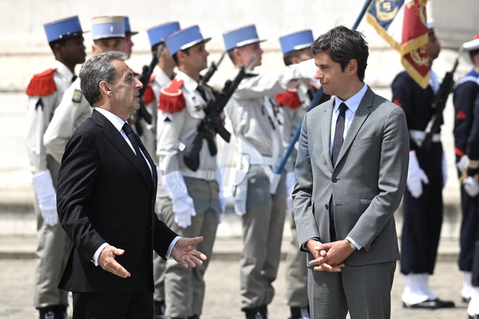 Nicolas Sarkozy et le Premier ministre Gabriel Attal and former pr - Cérémonie à l'Arc de Triomphe à Paris, à l'occasion du voyage officiel du président des Etats-Unis en France. Le 8 juin 2024 © Jeanne Accorsini / Pool / Bestimage Ceremony at the Arc de Triomphe in Paris, on the occasion of the official trip of the President of the United States to France. On June 8, 2024