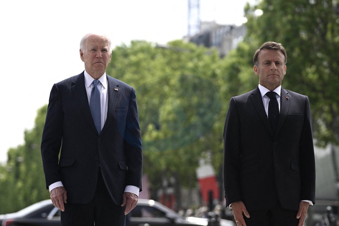 Emmanuel Macron et Joe Biden - Cérémonie à l'Arc de Triomphe à Paris, à l'occasion du voyage officiel du président des Etats-Unis en France. Le 8 juin 2024 © Jeanne Accorsini / Pool / Bestimage Ceremony at the Arc de Triomphe in Paris, on the occasion of the official trip of the President of the United States to France. On June 8, 2024
