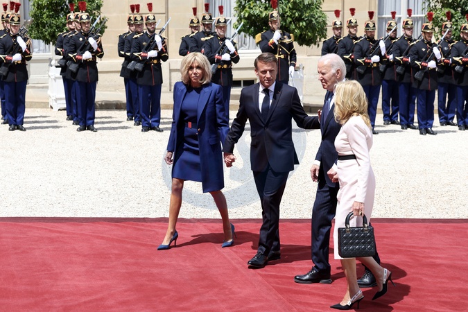 Le président français Emmanuel Macron et la première dame, Brigitte Macron accueillent le président américain Joe Biden et sa femme Jill Biden au palais de l'Elysee pour une visite d'état. Le 8 juin 2024. © Stéphane Lemouton / Bestimage The President of the United States and his wife arrive at the Elysée Palace in Paris on their state visit to France. June 8, 2024
