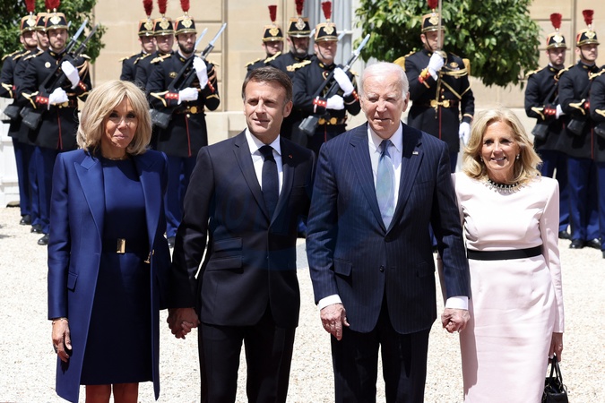 Le président français Emmanuel Macron et la première dame, Brigitte Macron accueillent le président américain Joe Biden et sa femme Jill Biden au palais de l'Elysee pour une visite d'état. Le 8 juin 2024. © Stéphane Lemouton / Bestimage The President of the United States and his wife arrive at the Elysée Palace in Paris on their state visit to France. June 8, 2024