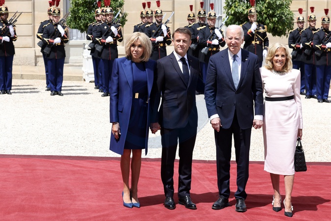 Le président français Emmanuel Macron et la première dame, Brigitte Macron accueillent le président américain Joe Biden et sa femme Jill Biden au palais de l'Elysee pour une visite d'état. Le 8 juin 2024. © Stéphane Lemouton / Bestimage The President of the United States and his wife arrive at the Elysée Palace in Paris on their state visit to France. June 8, 2024