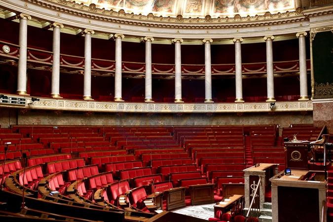 Illustration de l'hémicycle vide de l'Assemblée nationale française à Paris