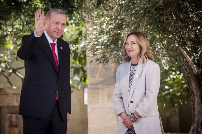 G7 Puglia, arrival of the Heads of State and Government of the Outreach Countries. In the picture Italian Prime Minister Giorgia Meloni and Turkish President Recep Tayyip Erdogan, Credit:Alessandro Serrano' / Avalon
