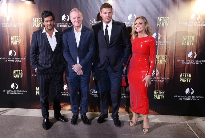 Noor Sadar, Ulrich Thomsen, David Boreanaz et Teresa Fernández-Valdés au photocall de l'after-party de la cérémonie d'ouverture du 63ème Festival de Télévision de Monte-Carlo à Monaco, le 14 juin 2024. © Denis Guignebourg/BestImage Photocall of the after-party of the opening ceremony of the 63rd Monte-Carlo Television Festival in Monaco, June 14, 2024.