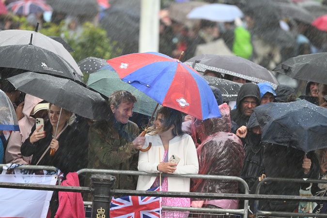 London, UK. 15th June, 2024. In a mix of torrential rain, thunder & lightning, and finally sunshine, Trooping the Colour for the King's Official Birthday Parade takes place with Catherine, Princess of Wales, attending. As the procession made its way along The Mall towards Buckingham Palace after the Review the weather became extreme for a while with thunder, lightning and very heavy rain., Credit:MALCOLM PARK / Avalon