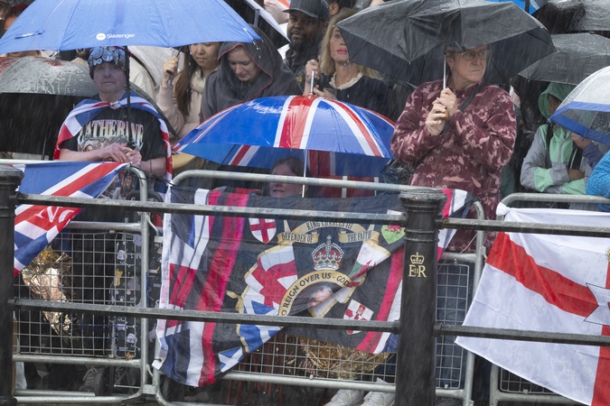London, UK. 15th June, 2024. In a mix of torrential rain, thunder & lightning, and finally sunshine, Trooping the Colour for the King's Official Birthday Parade takes place with Catherine, Princess of Wales, attending. As the procession made its way along The Mall towards Buckingham Palace after the Review the weather became extreme for a while with thunder, lightning and very heavy rain, Credit:MALCOLM PARK / Avalon