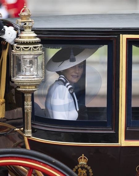 London, UK. 15th June, 2024. In a mix of torrential rain, thunder & lightning, and finally sunshine, Trooping the Colour for the King's Official Birthday Parade takes place with Catherine, Princess of Wales, attending. Image: Prince Louis and Catherine, Princess of Wales, Credit:MALCOLM PARK / Avalon