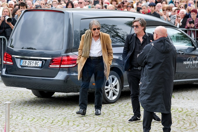Jacques Dutronc et son fils Thomas Dutronc - Arrivées aux obsèques de l'auteure-compositrice-interprète et actrice française Françoise Hardy au crématorium du cimetière du Père-Lachaise à Paris, France, le 20 juin 2024. © Jacovides-Moreau/Bestimage Arrivals at the funeral of French singer-songwriter and actress Françoise Hardy at Père-Lachaise Cemetery in Paris, France, on June 20, 2024.