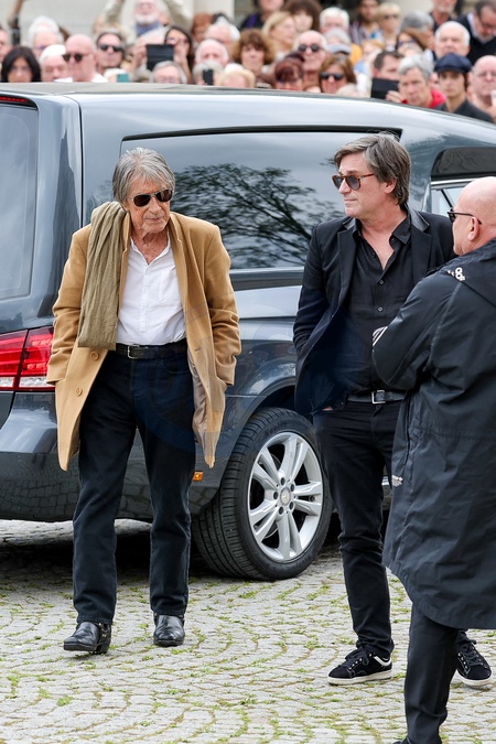 Jacques Dutronc et son fils Thomas Dutronc - Arrivées aux obsèques de l'auteure-compositrice-interprète et actrice française Françoise Hardy au crématorium du cimetière du Père-Lachaise à Paris, France, le 20 juin 2024. © Jacovides-Moreau/Bestimage Arrivals at the funeral of French singer-songwriter and actress Françoise Hardy at Père-Lachaise Cemetery in Paris, France, on June 20, 2024.