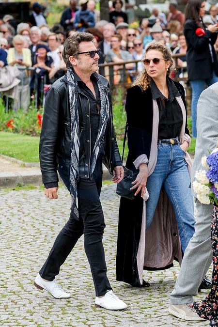 Matthieu Chedid et sa compagne Loïca Saint-M'leux, Louis Chedid - Arrivées aux obsèques de l'auteure-compositrice-interprète et actrice française Françoise Hardy au crématorium du cimetière du Père-Lachaise à Paris, France, le 20 juin 2024. © Jacovides-Moreau/Bestimage Arrivals at the funeral of French singer-songwriter and actress Françoise Hardy at Père-Lachaise Cemetery in Paris, France, on June 20, 2024.