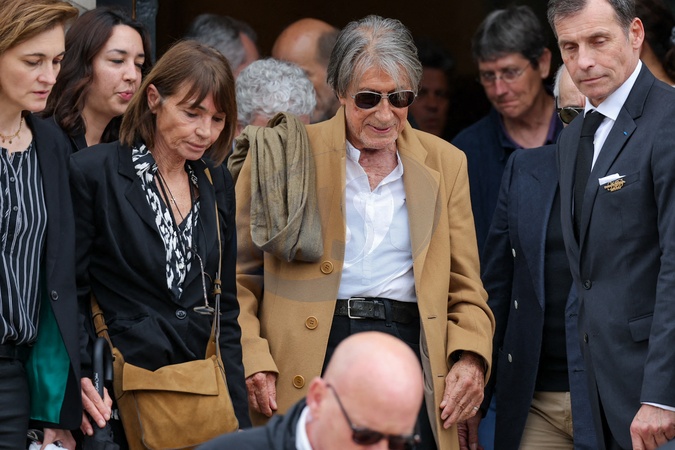 Jacques Dutronc et sa compagne Sylvie Duval - Sortie des obsèques de l'auteure-compositrice-interprète et actrice française Françoise Hardy au crématorium du cimetière du Père-Lachaise à Paris, France, le 20 juin 2024. © Jacovides-Moreau/Bestimage Exits at the funeral of French singer-songwriter and actress Françoise Hardy at Père-Lachaise Cemetery in Paris, France, on June 20, 2024.