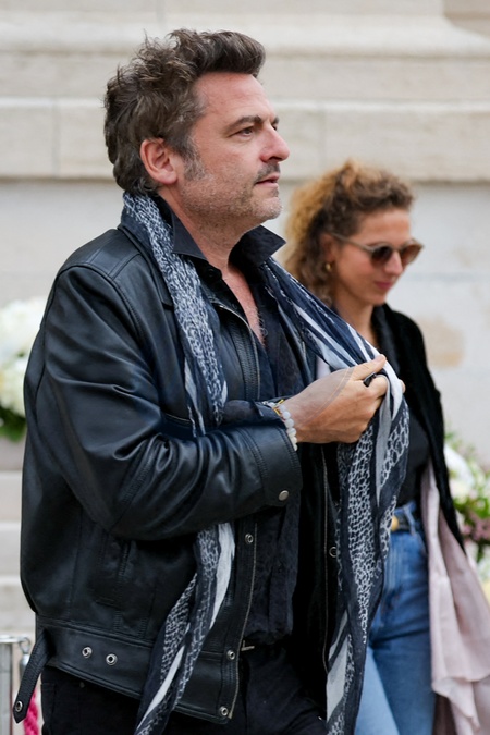 Matthieu Chedid, sa compagne Loïca Saint-M'leux, et son père Louis Chedid - Sortie des obsèques de l'auteure-compositrice-interprète et actrice française Françoise Hardy au crématorium du cimetière du Père-Lachaise à Paris, France, le 20 juin 2024. © Jacovides-Moreau/Bestimage Exits at the funeral of French singer-songwriter and actress Françoise Hardy at Père-Lachaise Cemetery in Paris, France, on June 20, 2024.