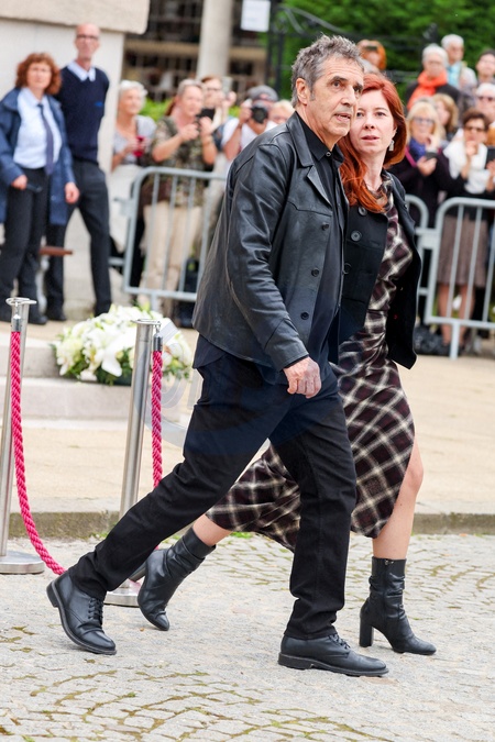 Julien Clerc et sa compagne Hélène Grémillon - Sortie des obsèques de l'auteure-compositrice-interprète et actrice française Françoise Hardy au crématorium du cimetière du Père-Lachaise à Paris, France, le 20 juin 2024. © Jacovides-Moreau/Bestimage Exits at the funeral of French singer-songwriter and actress Françoise Hardy at Père-Lachaise Cemetery in Paris, France, on June 20, 2024.
