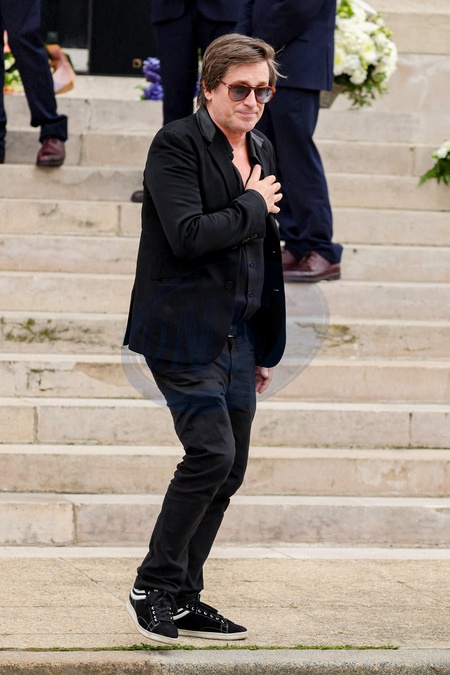 Thomas Dutronc, la main sur le coeur en guise de remerciement envers la foule d'admirateurs venue nombreuse pour rendre un dernier hommage à sa mère - Sortie des obsèques de l'auteure-compositrice-interprète et actrice française Françoise Hardy au crématorium du cimetière du Père-Lachaise à Paris, France, le 20 juin 2024. © Jacovides-Moreau/Bestimage Exits at the funeral of French singer-songwriter and actress Françoise Hardy at Père-Lachaise Cemetery in Paris, France, on June 20, 2024.