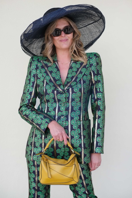 Stylish attendees on Ladies Day at Royal Ascot, Thursday 20 June 2024. Traditionally hats and fascinators are worn, but this image shows a more overall fashion look and its key points. Image shows Kiwi Estrid in her green trouser suit and yellow bag, Credit:Pat Lyttle / Avalon