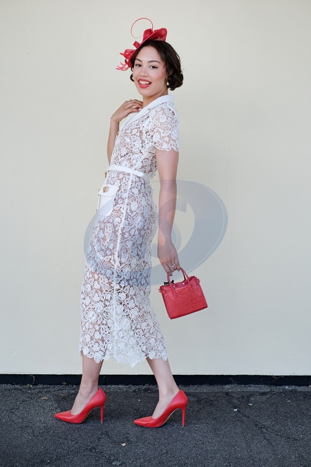 Stylish attendees on Ladies Day at Royal Ascot, Thursday 20 June 2024. Traditionally hats and fascinators are worn, but this image shows a more overall fashion look and its key points. Image shows Miriam Fearon in her white lace dress by Self Portrait, and red hat and bag, Credit:Pat Lyttle / Avalon