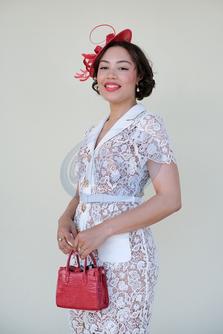 Stylish attendees on Ladies Day at Royal Ascot, Thursday 20 June 2024. Traditionally hats and fascinators are worn, but this image shows a more overall fashion look and its key points. Image shows Miriam Fearon in her white lace dress by Self Portrait, and red hat and bag, Credit:Pat Lyttle / Avalon