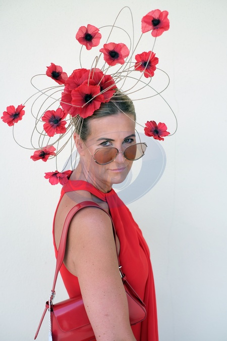 Stylish attendees on Ladies Day at Royal Ascot, Thursday 20 June 2024. Traditionally hats and fascinators are worn, but this image shows a more overall fashion look and its key points. Image shows a woman in a red dress with a red poppy hat, Credit:Pat Lyttle / Avalon