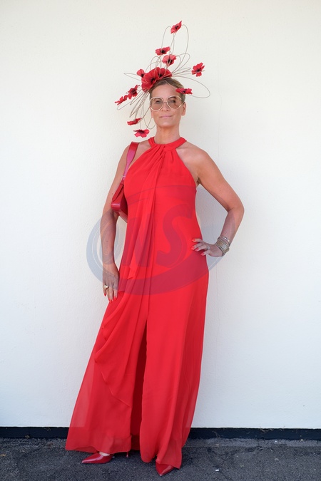 Stylish attendees on Ladies Day at Royal Ascot, Thursday 20 June 2024. Traditionally hats and fascinators are worn, but this image shows a more overall fashion look and its key points. Image shows a woman in a red dress with a red poppy hat, Credit:Pat Lyttle / Avalon