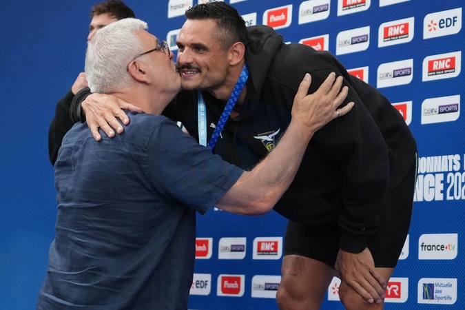 Florent Manaudou wygrywa zawody na 50 m stylem dowolnym pod okiem swojej partnerki Loli Dumenil, Mistrzostwa Francji w pływaniu 2024 w Chartres