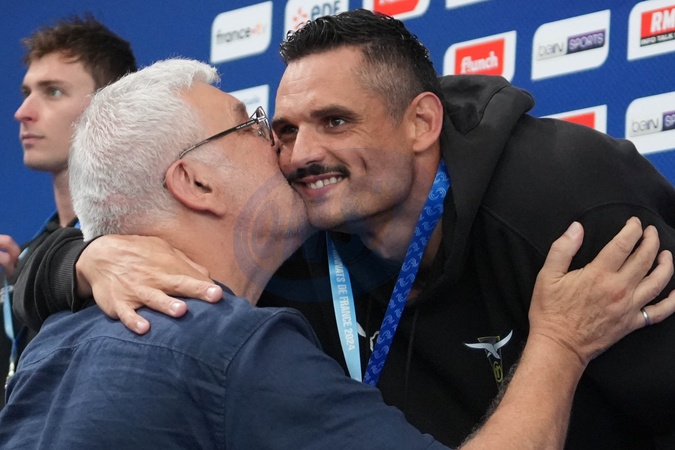 Jean-Luc Manaudou félicite son fils Florent Manaudou - F.Manaudou remporte l'épreuve du 50 m nage libre, sous le regard de sa compagne L.Dumenil, Championnats de France de Natation 2024 au centre aquatique Odyssée à Chartres, le 20 juin 2024. © Laurent Lairys / Panoramic / Bestimage F.Manaudou wins the 50m freestyle event, watched by his partner L.Dumenil, 2024 French Swimming Championships at the Odyssée aquatic center in Chartres, June 20, 2024.