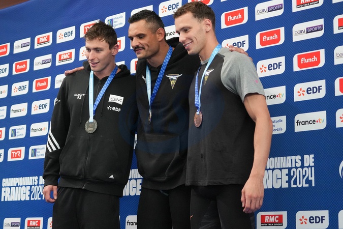 Maxime Grousset, Florent Manaudou et Pierre Lebois sur le podium - F.Manaudou remporte l'épreuve du 50 m nage libre, sous le regard de sa compagne L.Dumenil, Championnats de France de Natation 2024 au centre aquatique Odyssée à Chartres, le 20 juin 2024. © Laurent Lairys / Panoramic / Bestimage F.Manaudou wins the 50m freestyle event, watched by his partner L.Dumenil, 2024 French Swimming Championships at the Odyssée aquatic center in Chartres, June 20, 2024.