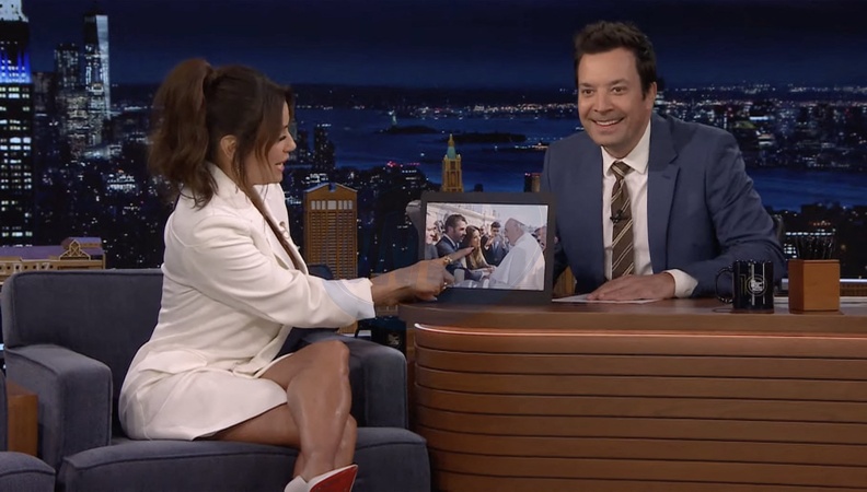 Pictures must credit: NBC Desperate Housewives star Eva Longoria has told how she went to Rome to get the Pope to bless her marriage — and ended up making it a confessional. The 49-year-old actress , wearing a stunning white jacket-style mini dress, told TV talk show host Jimmy Fallon about her trip after his own audience with Pope Francis earlier this month. Longoria's trip came just before her marriage to movie executive and producer , Mexican-born Jose Baston, 56, in 2016. He had one previous marriage while Longoria had two. She said Jose thought it would be wonderful if the Pope would bless their union. Explaining her meeting, she said because the Pope is Argentinian and her husband is Mexican she got him to teach her how to say ‘you holiness' in Spanish. But when the moment arrived she forgot it and blurted it out in English. Picture supplied by JLPPA