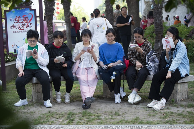 Students review their exam preparation materials in the last minutes before the National College Entrance Exam, or Gaokao, outside an exam venue in Hai'an city in east China's Jiangsu province Friday, June 07, 2024., Credit:XU JINBAI / Avalon