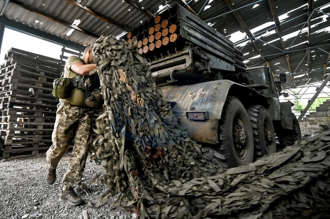 DONETSK REGION, UKRAINE - JUNE 12, 2024 - A serviceman of a rocket artillery battery of the 148th Separate Artillery Brigade of the Ukrainian Air Assault Forces takes camouflage netting off of a BM-21 Grad multiple rocket launcher, Donetsk region, eastern Ukraine., Credit:Dmytro Smolienko / Avalon