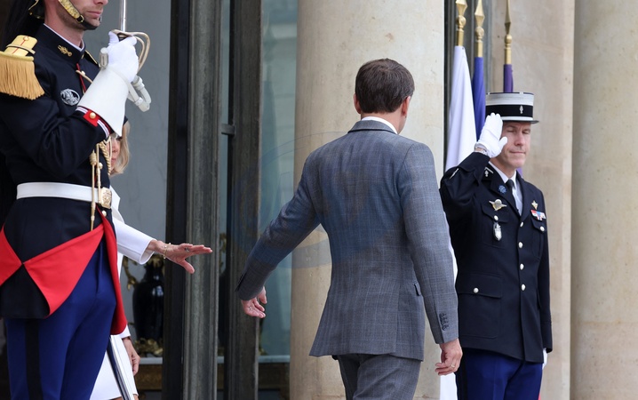 Le Président de la République française, Emmanuel Macron et la première dame Brigitte Macron reçoivent le Roi Abdallah II de Jordanie et la Reine Rania, pour un déjeuner de travail au Palais de l’Elysée à Paris