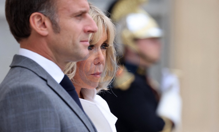 Prezydent Republiki Francuskiej Emmanuel Macron i pierwsza dama Brigitte Macron przyjmują króla Jordanii Abdullaha II i królową Ranię na roboczym obiedzie w Pałacu Elizejskim w Paryżu